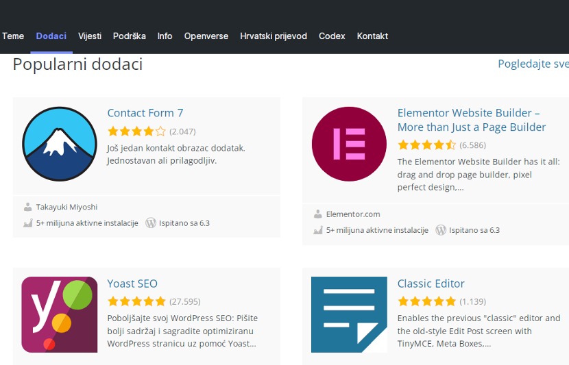 Dodati dodatke: Instalirajte osnovne dodatke poput Yoast SEO, Contact Form 7 i Elementor.