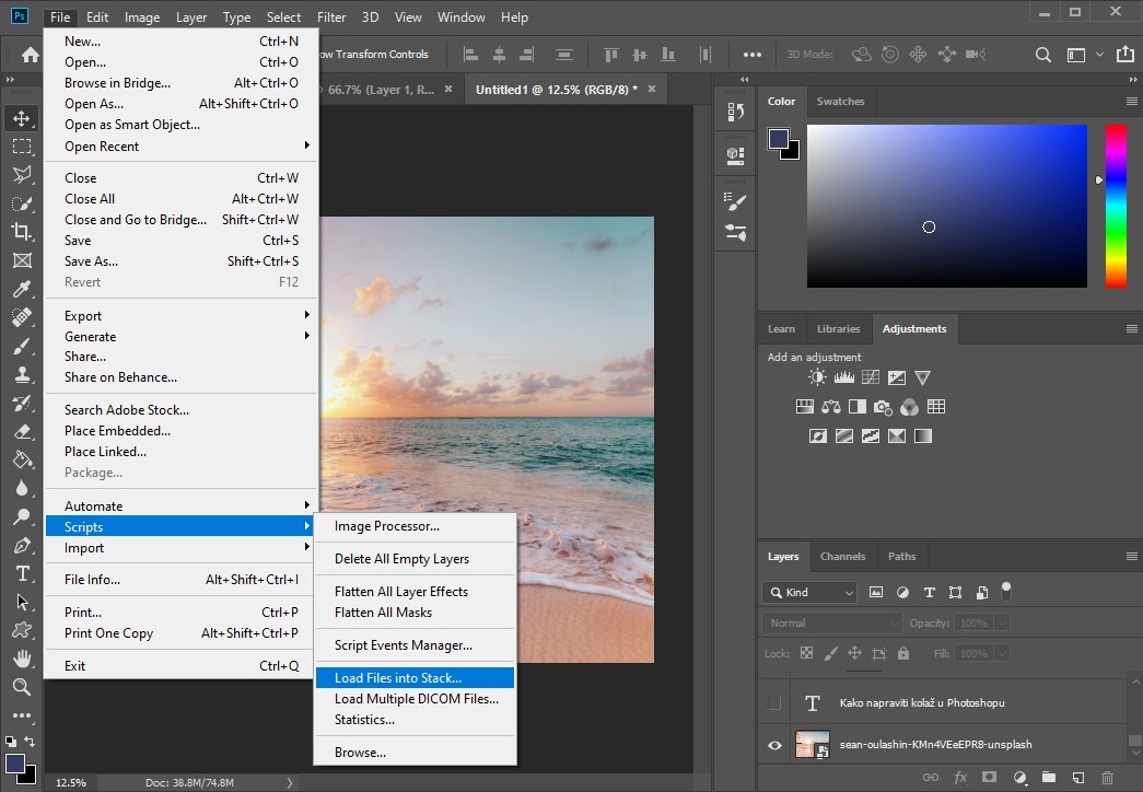Ostale fotografije, više njih odjednom sam otvorio tako što sam otišao na “Scripts”, zatim na opciju “Load file into stack”. Onda sam ih povukao iz fajla u kojem su se sve grupno nalazile.