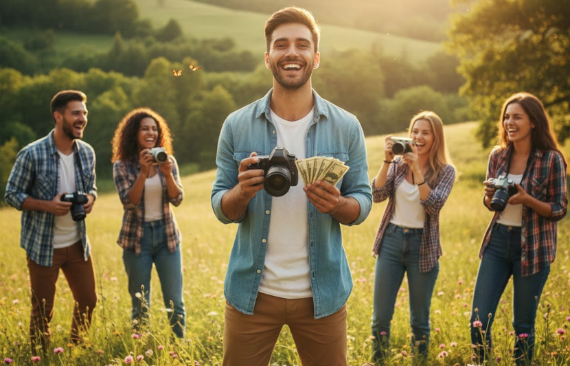 Kako kao freelancer zaraditi novac na Shutterstocku, Fotograf sa novcem i kamerom u prirodi, kreirao Gemini AI
