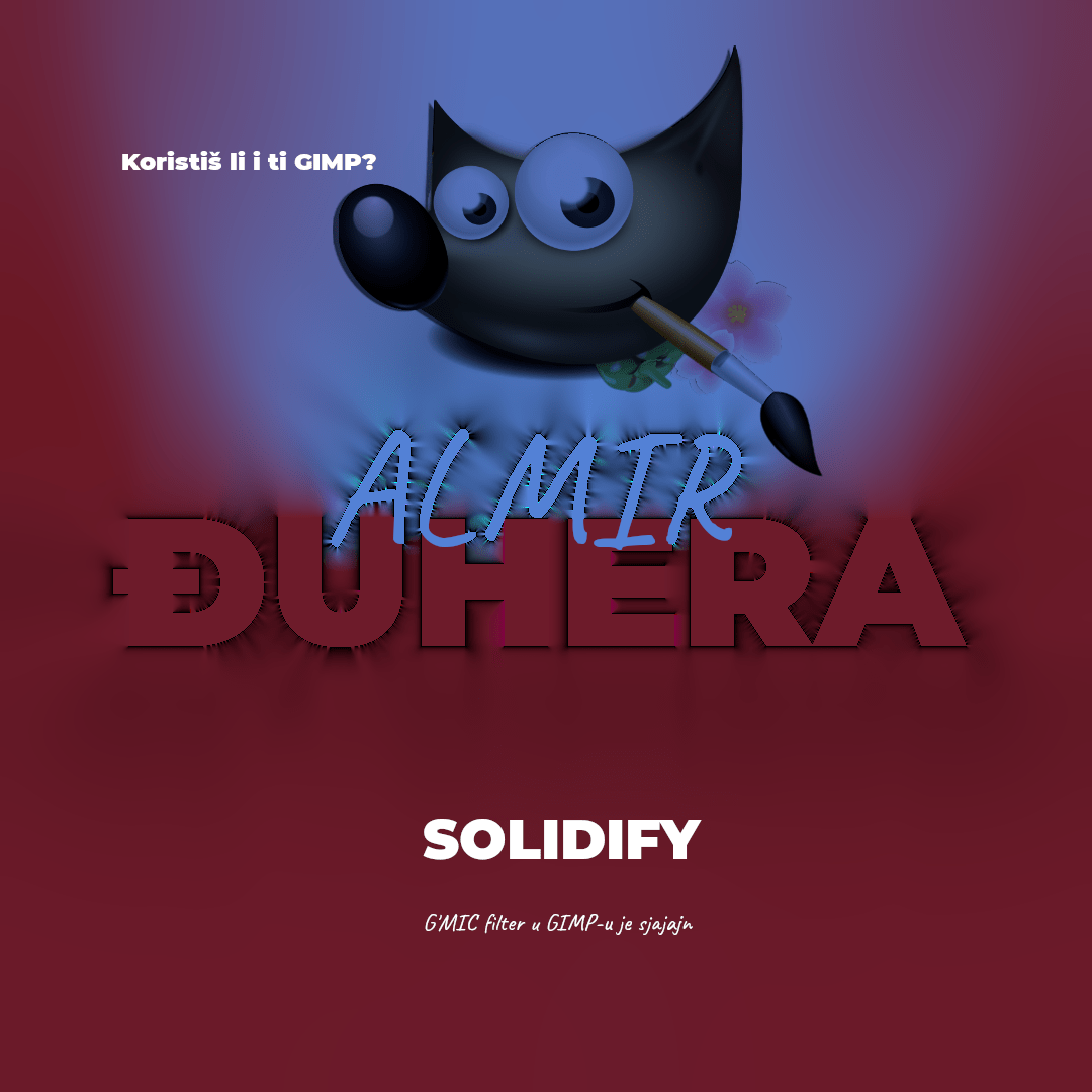 Inače, Solidify filter je sastavni dio dodatka G’MIC za GIMP. U dodatku, pored Solidify filtera nalazi se još 583 filtera koji su razvrstani u nekoliko oblasti. Ta brojka od 584 filtera jasno vam ukazuje koliki trud i energija su uloženi u stvaranje G’MIC-a. U tom smislu autorima se treba od srca zahvaliti na njihovom radu, zar ne?! David Tschumperle i Sebastien Fourey, hvala vam velika na vašem radu!!!